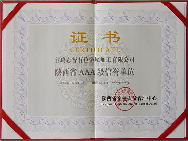 2016年7月,寶雞志普有色金屬加工有限公司被陜西省質(zhì)量管理中心授予陜西省AAA級(jí)信譽(yù)單位。